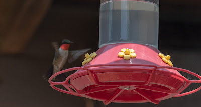 DeleteThey have to feed every 10-15 minutes and they tend to come from the same direction (I have eastside and westside gangs). Best times are early and late. The more you are out there, the more comfortable they get with you. Mine buzz my head as I take down the feeders to refill them. I would set up the tripod aimed at the feeder with a good ball head and lock spot focus at the yellow flower outlet. When they show up, let fly. An alternative is to area focus on the barrel of the feeder and increase the DOF, then burst mode all day! Hey, film is cheap, right? And wider is better because you can always crop in.